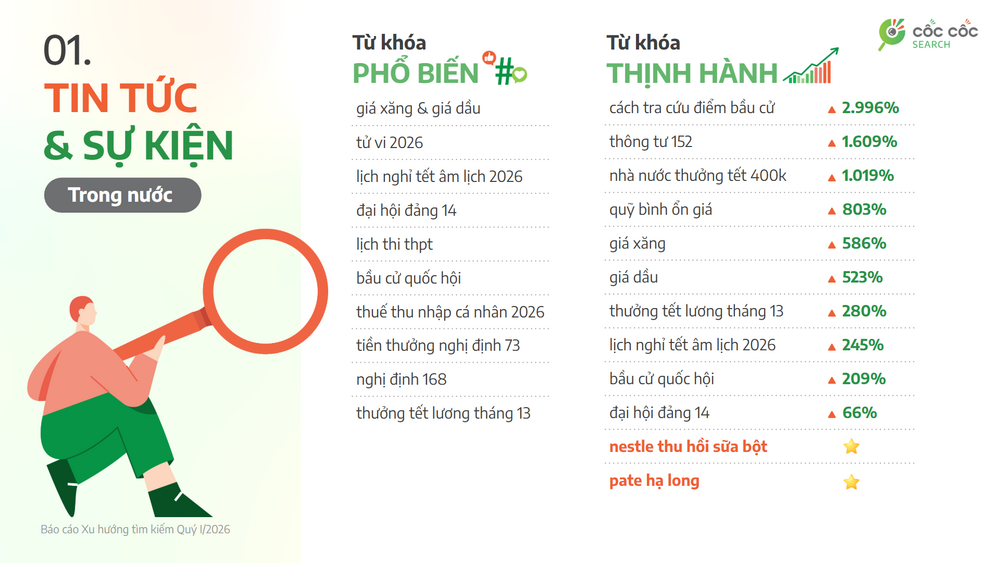 Ngày 15/4, nền tẳng Cốc Cốc vừa chính thức phát hành Báo cáo xu hướng tìm kiếm Quý I/2026 với nhiều thông tin đáng chú ý về xu hướng tìm kiếm của người Việt trong quý đầu năm với những thông tin trải rộng trên nhiều nhóm chủ đề khác nhau.