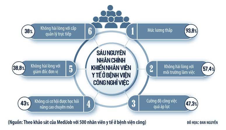 Bác sĩ Trần Văn Phúc (Bệnh viện Đa khoa Xanh Pôn) cho rằng, môi trường làm việc và thu nhập là 2 lý do chính khiến nhân viên y tế “dứt áo” ra đi. Cụ thể, tại Bệnh viện Đa khoa Xanh Pôn, nhân viên y tế phải làm việc ít nhất 8 – 10 giờ mỗi ngày, trực 24 tiếng vào các ngày thứ Sáu, thứ Bảy; ngày lễ không nghỉ bù theo quy định của pháp luật, nhưng cũng không được tính tiền công làm thêm giờ.