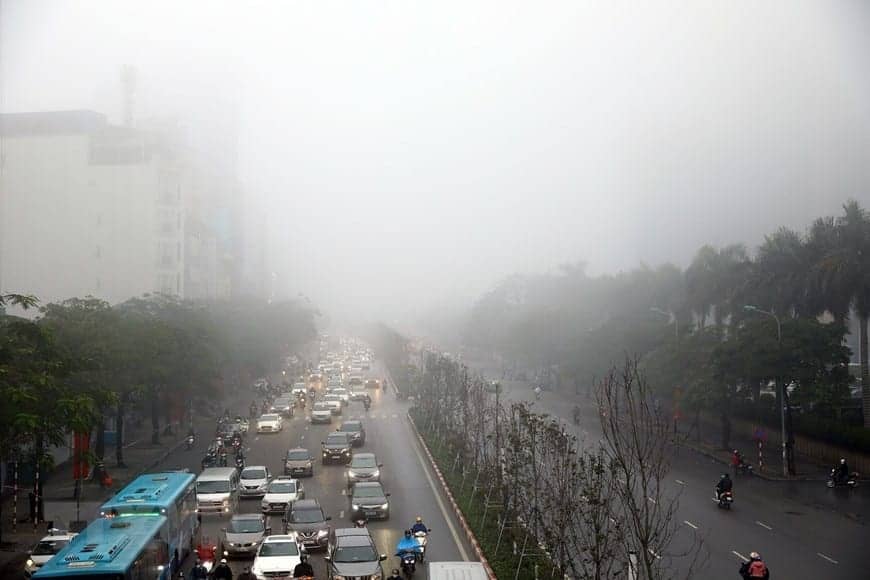 Đến 8h sáng, sương mù vẫn bao phủ dày đặc. Ở vùng ven đô, sương giăng kín trên cánh đồng, đứng cách xa 50 m không nhìn thấy nhau. Các phương tiện phải bật đèn vàng, di chuyển chậm. Trong khi đó, ở nội đô, đứng từ các ngôi nhà từ 5 tầng trở lên, người dân không nhìn thấy được mặt đất.