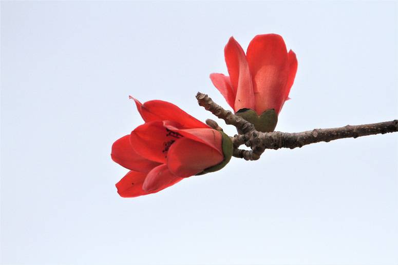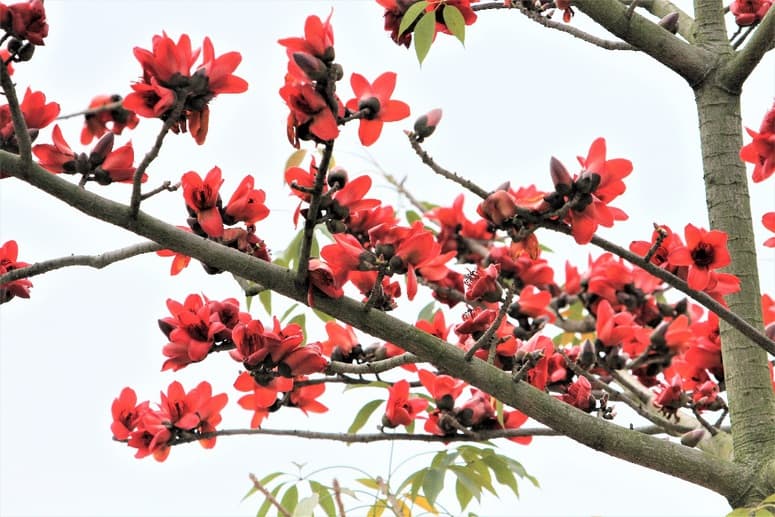 Cùng với màu vàng rực rỡ của hoa phong linh, những bông hoa gạo cũng trổ màu đỏ tươi khoe sắc, tạo nên nét độc đáo riêng của đoạn đường này.