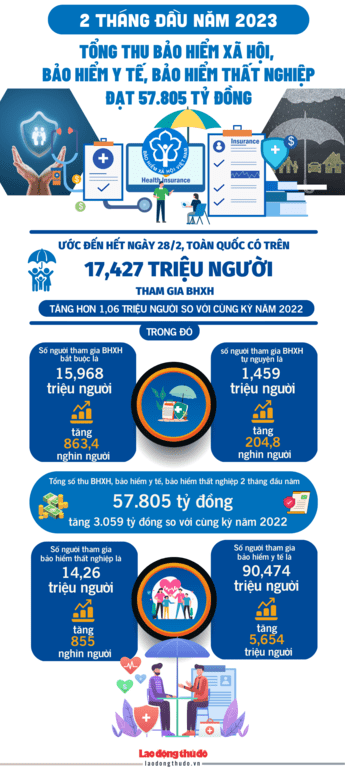 Theo Bảo hiểm Xã hội (BHXH) Việt Nam, trong 2 tháng đầu năm 2023, cả nước đã có hơn 17,427 triệu người tham gia bảo hiểm xã hội, tăng hơn 1,06 triệu người so với cùng kỳ năm 2022. Tổng số thu bảo hiểm xã hội, bảo hiểm y tế, bảo hiểm thất nghiệp đạt 57.805 tỷ đồng, tăng 3.059 tỷ đồng so với cùng kỳ năm 2022.