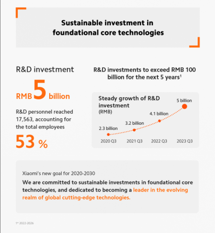 Trong quý 3 năm 2023, chi phí R&D của Xiaomi đạt hơn 700 triệu USD, tăng 22% so với cùng kỳ. Đội ngũ nhân sự R&D được mở rộng, chiếm hơn 53% tổng số lao động. Tập đoàn đã nâng cấp chiến lược từ “Điện thoại thông minh và AIoT” lên thành “Con người – Ô tô – Nhà cửa”. Đồng thời, hãng cũng đã công bố hệ điều hành hoàn toàn mới Xiaomi HyperOS, tích hợp mọi nhu cầu của người tiêu dùng trong một hệ sinh thái thông minh từ thiết bị cá nhân, sản phẩm nhà thông minh, đến di động thông minh .