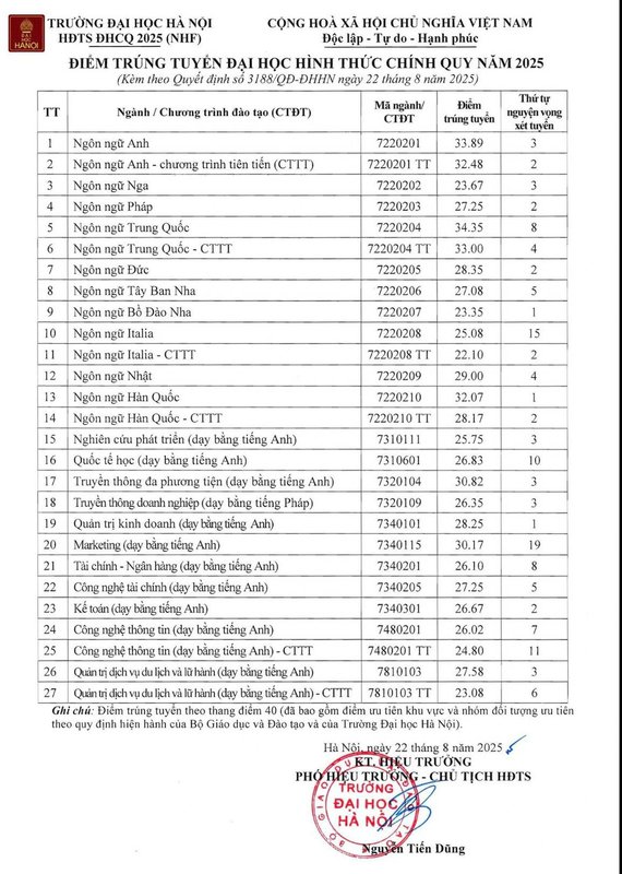Điểm chuẩn Đại học Hà Nội cao nhất 34,35/40. Trường Đại học Hà Nội chiều 22/8 công bố điểm chuẩn từ 22,1 đến 34,35 điểm, theo thang 40. Trong đó, ngành Ngôn ngữ Trung Quốc cao nhất, song giảm 1,45 điểm so với năm trước. Ngành Ngôn ngữ Italy lấy thấp nhất – 22,1.