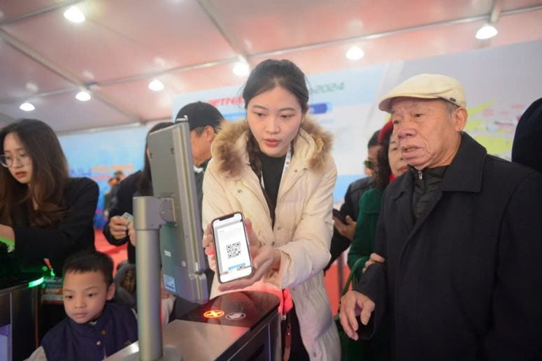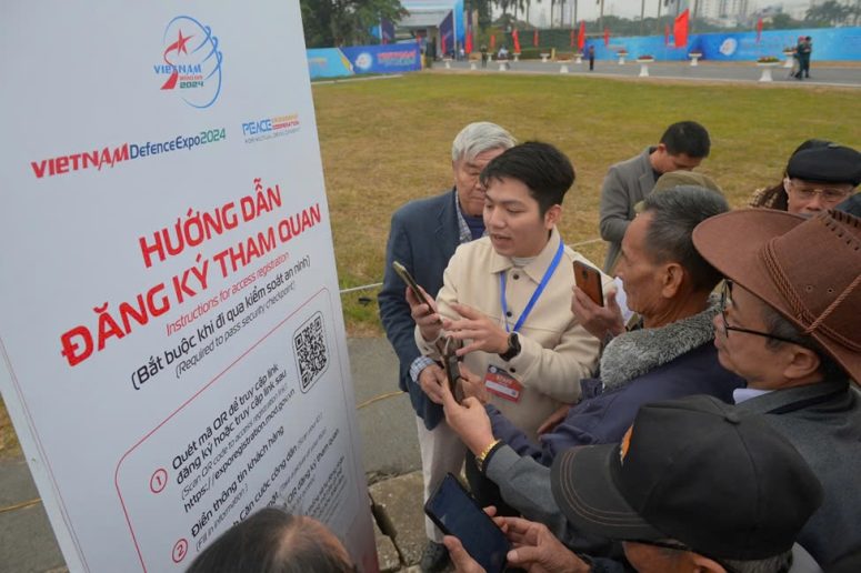 Ban tổ chức hướng dẫn người dân cách kiểm tra thông tin đăng ký. Khách đến tham quan cần đáp ứng các thủ tục nghiêm ngặt: quét mã QR, khai báo thông tin đầy đủ và sau đó di chuyển qua cổng kiểm tra an ninh.