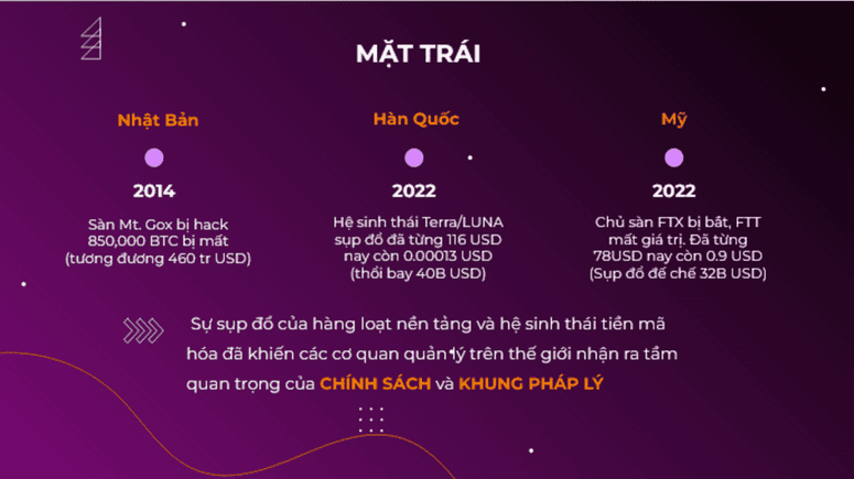Qua phân tích các rủi ro, những “case study” tiêu biểu, ông Phan Đức Trung nhấn mạnh, thông qua sự sụp đổ của hàng loạt nền tảng và hệ sinh thái tiền mã hóa đã khiến đại đa số các cơ quan quản lý trên thế giới nhận ra tầm quan trọng của CHÍNH SÁCH và KHUNG PHÁP LÝ với sự phát triển ổn định, lành mạnh của Blockchain và những ứng dụng cụ thể của nền tảng này.