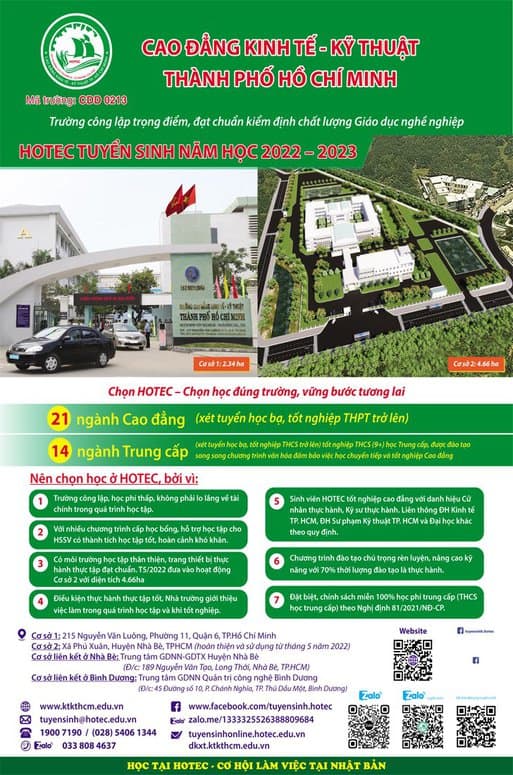 Trường có 5 ngành nghề trọng điểm cấp độ Quốc gia, khu vực Asean và Quốc tế. Tỷ lệ việc làm của học viên sinh viên ra trường năm 2021 là 81% (trong đó có 67% đúng ngành đào tạo). Từ tháng 3 này, Trường HOTEC cũng đã bắt đầu nhận hồ sơ xét tuyển. Trường xét tuyển chủ yếu dựa vào học bạ THPT của thí sinh.