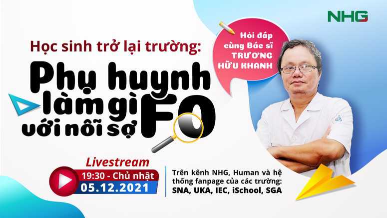 Nhằm giải đáp cho phụ huynh về những băn khoăn, thắc mắc về đảm bảo an toàn cho con khi quay lại trường, Tập đoàn giáo dục Nguyễn Hoàng (NHG) phối hợp cùng các trường trong hệ thống tổ chức buổi livestream “Hỏi đáp cùng bác sĩ Trương Hữu Khanh: Học sinh trở lại trường – phụ huynh làm gì với nỗi sợ F0?” vào lúc 19:30, Chủ nhật, ngày 5/12.