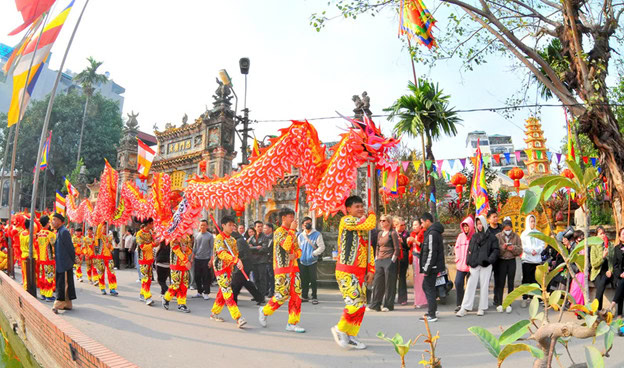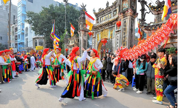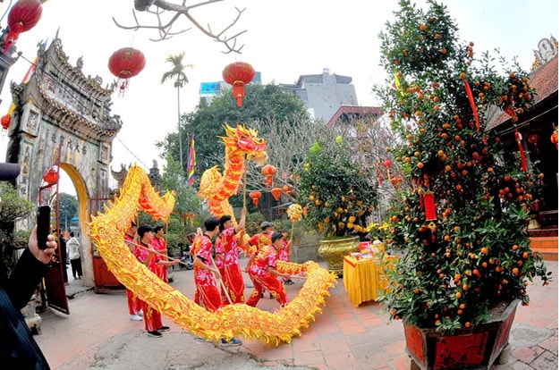 Sau phần nghi lễ rước kiệu trang trọng, không khí hội làng thêm phần sôi động với những màn múa lân, múa rồng, tạo nên một bức tranh lễ hội rực rỡ trong những ngày đầu năm.