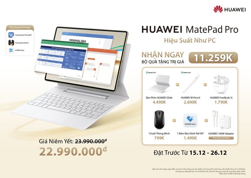 Tại lễ ra mắt, đại diện Huawei công bố, từ ngày 15/12 đến 26/12, khi mua máy tính bảng Huawei MatePad Pro 12.2 inch tại hệ thống CellphoneS, Hoàng Hà Mobile, FPT Shop, Di Động Việt, và sàn thương mại điện tử Shopee, Lazada, TikTok Shop người dùng sẽ nhận được ưu đãi giảm giá 1.000.000 đồng (còn 22.990.000 đồng) và bộ quà tặng trị giá 11.259.000 đồng bao gồm bàn phím HUAWEI Glide, bút HUAWEI M-Pencil, tai nghe HUAWEI FreeBuds 5i, chuột thông minh HUAWEI và 1 năm bảo hành rơi vỡ.