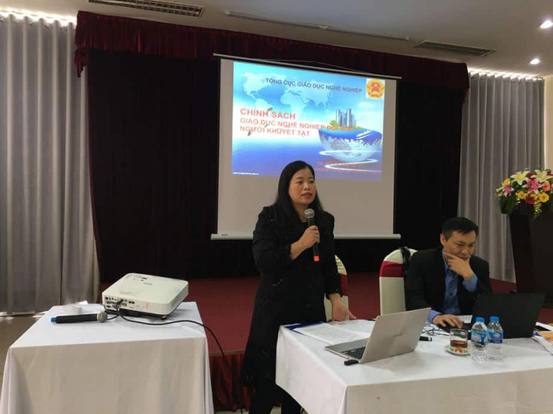 Chia sẻ tại buổi tập huấn, TS Phạm Thị Hoàn – Phó Vụ trưởng Vụ Đào tạo thường xuyên, Tổng cục Giáo dục nghề nghiệp, Bộ Lao động – Thương binh và Xã hội cũng trình bày tham luận “Chính sách Giáo dục nghề nghiệp đối với NKT”.