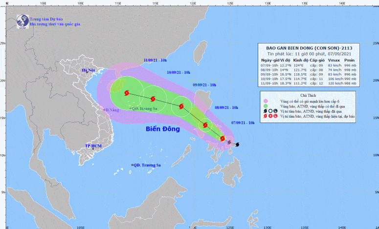Theo Giám đốc Trung tâm Dự báo Khí tượng Thủy văn Quốc gia Mai Văn Khiêm, có thể trong đêm nay, 8/9, bão Conson sẽ đi vào Biển Đông và trở thành cơn bão số 5 năm 2021. Dự báo, bão sẽ di chuyển chủ đạo hướng Tây Bắc, tốc độ 20 km/giờ về phía vịnh Bắc Bộ và giữa khu vực Bắc Bộ và Bắc Trung Bộ, đạt cấp mạnh nhất 11 khi đi qua quần đảo Hoàng Sa, trước khi tiến vào gần đảo Hải Nam (Trung Quốc) và suy yếu dần. Bão có thể gây gió mạnh trên vùng biển Bắc Biển Đông, trong các ngày từ 9-11/9, trong đó khu vực quần đảo Hoàng Sa có gió mạnh cấp 11 trong ngày 10/9.