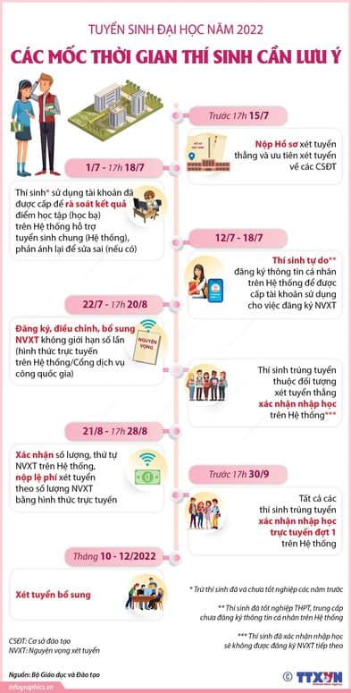 Trang Chủ » Nghề nghiệp và Cuộc sống » Nhịp sống mới » [Infographic] Tuyển sinh đại học năm 2022: Các mốc thời gian thí sinh cần lưu ý 12/07/2022 8:18:22 Nhịp sống mới [Infographic] Tuyển sinh đại học năm 2022: Các mốc thời gian thí sinh cần lưu ý Posted on 12/07/202227/03/2025 by Phan Hải 12 Th7 Bổ nhiệm “Đại sứ danh dự du lịch Hàn Quốc tại Việt Nam” Thống nhất “nhường” hơn 1.000 ha rừng cho cao tốc Bắc – Nam