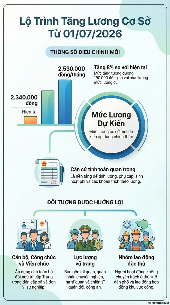 Dự kiến lương cơ sở sẽ được điều chỉnh tăng lên mức 2.530.000 đồng/tháng từ ngày 1/7/2026.