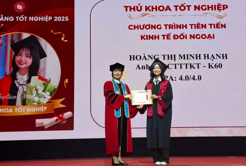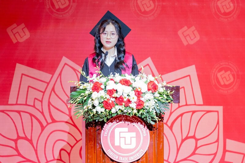 Tại buổi lễ, PGS. TS Phạm Thu Hương – Hiệu trưởng FTU đã biểu dương thành tích học tập, rèn luyện của tất cả sinh viên. Nhắn nhủ tới các tân cử nhân, bà Hương chia sẻ: “Với vai trò của người đi trước, cô mong muốn chia sẻ với các em rằng bất cứ con đường sự nghiệp nào mang lại giá trị cho cuộc sống đều trân quý và hành trình để đạt được những thành tựu trên con đường đó đều cần rất nhiều nỗ lực và công sức…”.