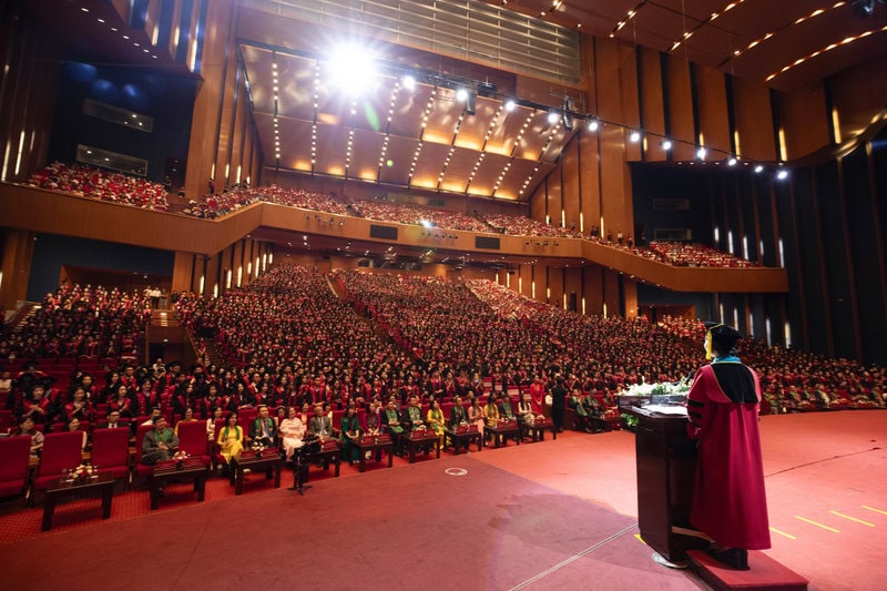 Một trong những điểm nhấn giàu cảm xúc của chương trình là khi cả hội trường cùng lắng lại, hướng ánh nhìn về màn hình lớn, nơi những hình ảnh của các lớp hành chính trong khung hình cử nhân được tái hiện. Khoảnh khắc ấy như đưa mọi người ngược dòng ký ức, gợi nhắc những tháng ngày học tập, gắn bó, sẻ chia và trưởng thành bên bạn bè, thầy cô, để rồi lắng đọng thành niềm tự hào và sự biết ơn sâu sắc.