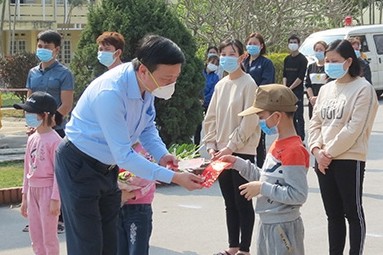 Trao quà mừng tuổi nhân dịp Tết Nguyên đán Tân Sửu cho các bệnh nhân nhỏ tuổi được chữa khỏi bệnh và xuất viện, Bí thư Tỉnh ủy Hải Dương Phạm Xuân Thăng đề nghị mọi người về gia đình thực hiện nghiêm quy định tự cách ly theo quy định.