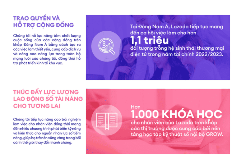 Trong năm tài chính 2022 – 2023, Lazada đã tiếp tục mang đến cơ hội việc làm cho hơn 1,1 triệu đối tượng trong hệ sinh thái thương mại điện tử của mình. Cùng với đó là hơn 1.000 khóa học hỗ trợ, thúc đẩy kỹ năng lao động số cho nhân viên để giúp họ vững vàng hơn trong bối cảnh thế giới thay đổi nhanh chóng…