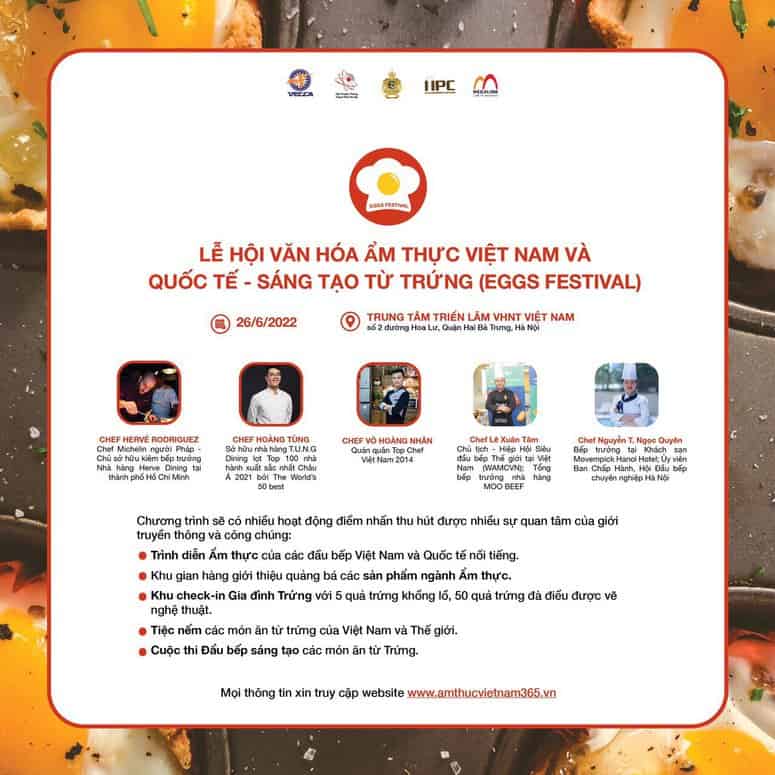 Trong khuôn khổ chương trình, 5 đầu bếp nổi tiếng của Việt Nam và quốc tế tham gia trình diễn các món trứng độc đáo của mình tại Lễ hội: Chef Hervẻ Rodriguez, đầu bếp Michelin người Pháp, chủ sở hữu kiêm bếp trưởng nhà hàng Herve Dinning tại Tp. Hồ Chí Minh; Chef Hoàng Tùng, sở hữu nhà hàng T.U.N.G Dining lọt Top 100 nhà hàng xuất sắc nhất Châu Á 2021 bởi The World’s 50 best: Chef Võ Hoàng Nhân -Quán quân Top Chef Việt Nam 2014; Chef Lê Xuân Tâm – Chủ tịch – Hiệp Hội Siêu Đầu Bếp Thế giới tại Việt Nam; Chef Nguyễn Thị Ngọc Quyên – Bếp trưởng tại Khách sạn Movenpick Hà Nội.