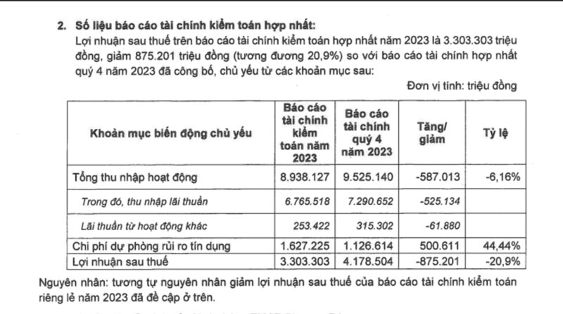 Sau kiểm toán, tổng thu nhập hoạt động của ngân hàng ghi nhận 8.935 tỷ đồng, giảm 587 tỷ đồng so với báo cáo quý 4/2023, tương đương mức giảm 6%. Trong đó, thu nhập lãi thuần giảm 525 tỷ đồng và lãi từ hoạt động khác giảm 61 tỷ đồng.