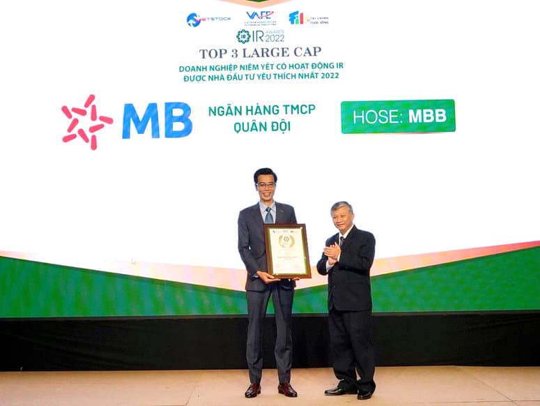 Với những nỗ lực hoàn thiện, chuẩn hóa hoạt động IR (Investor Relations – Quan hệ nhà đầu tư), Ngân hàng TMCP Quân đội với mã cổ phiếu MBB vinh dự nằm trong Top 3 Doanh nghiệp niêm yết có vốn hóa lớn (Large Cap) được nhà đầu tư yêu thích nhất và top 4 doanh nghiệp niêm yết có vốn hóa lớn (Large Cap) được định chế tài chính đánh giá cao nhất.