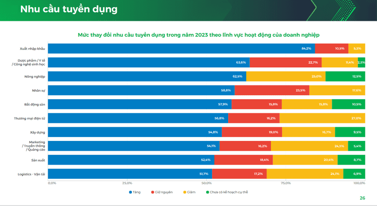 Đáng chú ý, xuất nhập khẩu là lĩnh vực có đến hơn 80% doanh nghiệp dự kiến tăng nhu cầu tuyển dụng trong năm 2023, chiếm tỷ lệ cao nhất trong các lĩnh vực doanh nghiệp tham gia khảo sát.