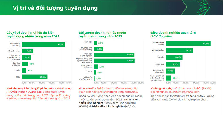 Đồng thời, Kinh doanh/bán hàng, IT phần mềm và marketing/truyền thông/quảng cáo là 3 vị trí được tuyển dụng nhiều nhất trong năm 2022 – tiếp tục là những vị trí được doanh nghiệp “săn đón” trong năm 2023.