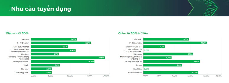 Chiều ngược lại, thương mại điện tử lại là lĩnh vực có tỷ lệ doanh nghiệp dự kiến giảm nhu cầu tuyển dụng nhiều nhất (27%). Trong đó, 16,2% doanh nghiệp dự định giảm nhu cầu tuyển dụng từ 30% trở lên so với năm 2022.