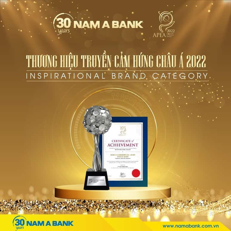 Sự ghi nhận của các tổ chức uy tín trong nước và quốc tế tiếp tục khẳng định hoạt động kinh doanh hiệu quả, minh bạch của Nam A Bank trên thị trường. Inspirational Brand Award – “Thương hiệu truyền cảm hứng Châu Á 2022” là hạng mục giải thưởng quan trọng trong các hạng mục của APEA, chỉ dành riêng cho những doanh nghiệp có thương hiệu sản phẩm dịch vụ truyền cảm hứng hoặc ảnh hưởng tích cực tới cộng đồng và được người tiêu dùng, công chúng tin tưởng lựa chọn, ủng hộ.