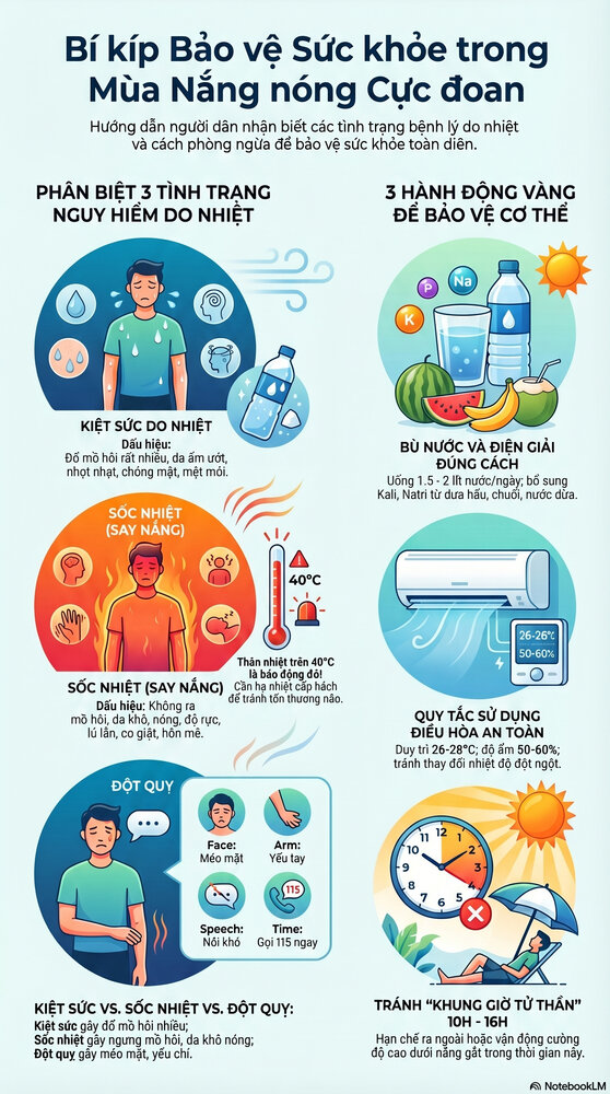 Trước thực tế này, các chuyên gia khuyến cáo người dân cần chủ động phòng ngừa. Việc hạn chế tiếp xúc trực tiếp với nắng gắt, đặc biệt vào khung giờ cao điểm, là biện pháp quan trọng. Đồng thời, cần bổ sung đủ nước để tránh tình trạng mất nước và duy trì độ loãng của máu.