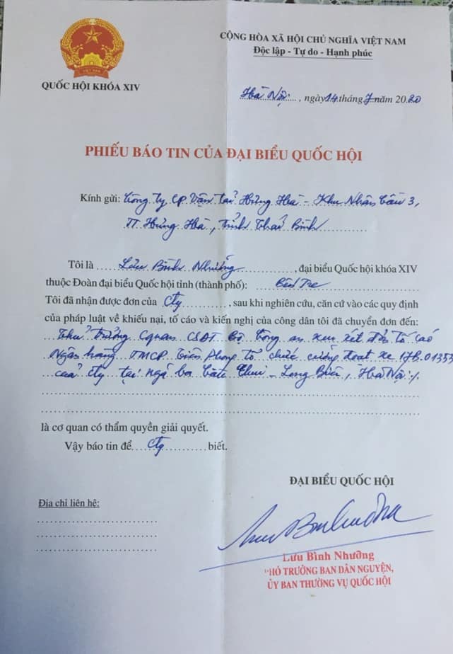 Ông Lưu Bình Nhưỡng – Phó Trưởng Ban dân nguyện Quốc hội, Đại biểu Quốc hội khóa XIV đã có phiếu chuyển đơn gửi tới các cơ quan chức năng, đề nghị xem xét giải quyết vụ việc cưỡng đoạt xe của TP Bank