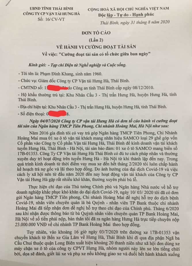 Trong đơn gửi tới Tạp chí điện tử Nghề nghiệp và Cuộc sống, ông Phạm Đình Khang – Giám đốc Công ty Cổ phần Vận tải Hưng Hà (Công ty CP Vận tải Hưng Hà) bức xúc cho biết, Ngân hàng Thương mại Cổ phần Tiên Phong (Ngân hàng TMCP Tiên Phong hay còn gọi là TP Bank) chi nhánh Hoàng Mai (Hà Nội) đã có hành vi cưỡng đoạt tài sản, thu hồi nợ theo kiểu xã hội đen khiến doanh nghiệp của ông đang đứng trên bờ vực phá sản, hơn 20 người lao động có nguy cơ bị thất nghiệp.