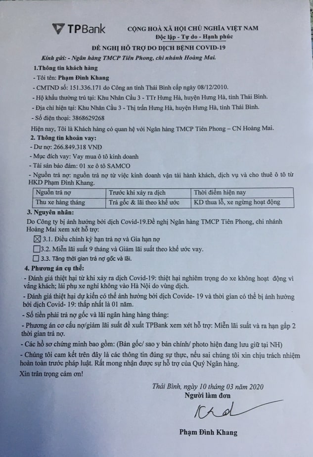 Ngày 10/03/2020, ông Khang có đơn gửi Ngân hàng TMCP Tiên phong, Chi nhánh Hoàng Mai đề nghị hỗ trợ do dịch bệnh Covid-19