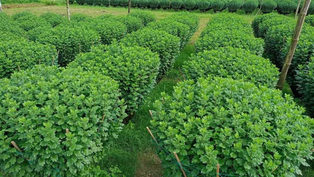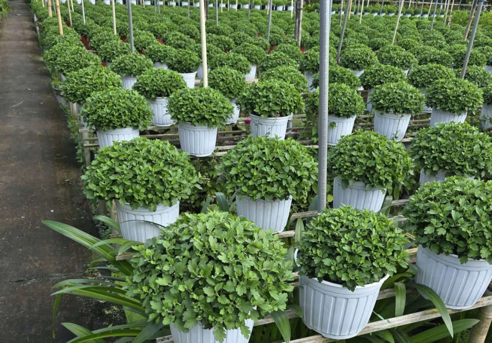 Các chậu cúc lớn đang được chăm sóc kỹ lưỡng để ép nụ. Ảnh: Quang Trung
