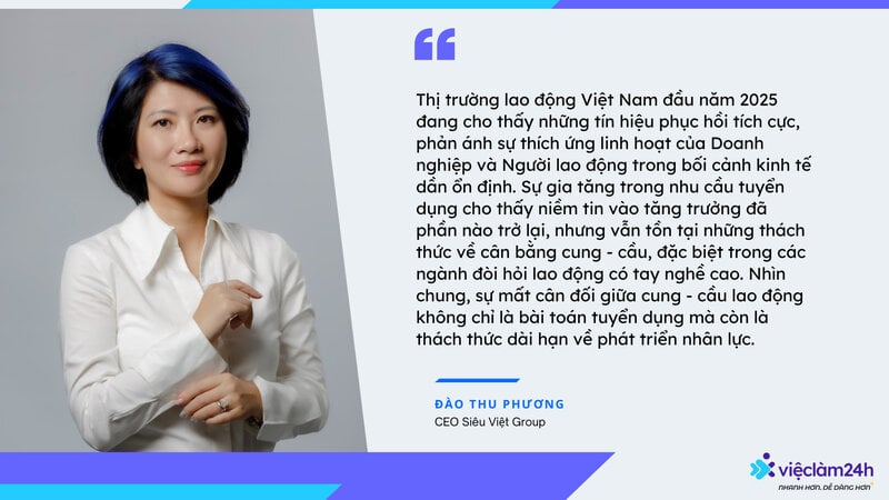 Theo bà Đào Thu Phương, CEO Siêu Việt Group (Vieclam24h), sự gia tăng trong nhu cầu tuyển dụng cho thấy niềm tin vào tăng trưởng đã phần nào trở lại, nhưng vẫn tồn tại những thách thức về cân bằng cung – cầu, đặc biệt trong các ngành đòi hỏi lao động có tay nghề cao.