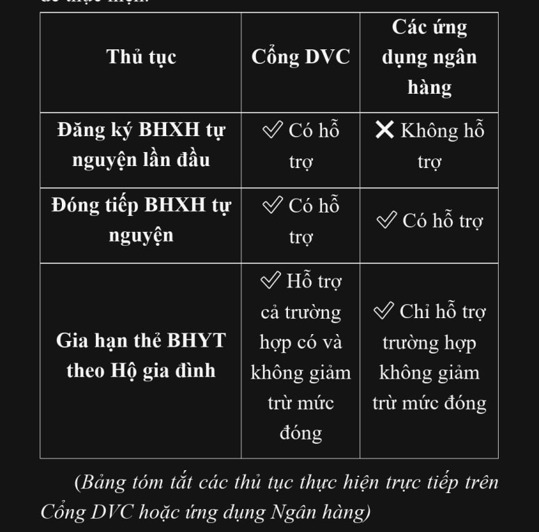 Người dân có nhu cầu tự tham gia BHXH (BHXH tự nguyện), BHYT (theo hình thức Hộ gia đình) không cần trực tiếp đến cơ quan BHXH hay Tổ chức dịch vụ được ủy quyền thu BHXH, BHYT mà có thể thực hiện trên Cổng Dịch vụ công (DVC) hoặc trên ứng dụng trực tuyến của một số ngân hàng đảm bảo giao dịch nhanh gọn, thuận tiện. Cụ thể như sau: