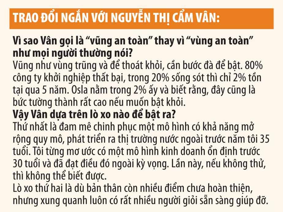 Sau nhiều lần vượt vũng an toàn, Nguyễn Thị Cẩm Vân đang chuẩn bị bẻ lái OSLA theo hướng trở thành một công ty công nghệ giáo dục, mở rộng quy mô ra ngoài biên giới Việt Nam.