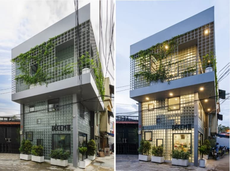 Các KTS xác định với yêu cầu và diện tích như vậy, căn nhà được sử dụng gạch kính mờ làm điểm nhấn, ẩn các không gian riêng tư sau hệ vách, cửa gỗ sơn trắng cùng màu tường. Theo KTS, các ô cửa kính ngoài chức năng lấy ánh sáng, giúp nhà thoáng, còn giúp công trình có sự hài hoà với cảnh quan xung quanh. Khi đêm về, ánh đèn từ hệ thống ánh sáng trong nhà xuyên qua tường gạch kính giúp ngôi nhà tựa chiếc đèn lồng phát sáng giữa khu phố rất thích hợp cho việc trưng bày sản phẩm đồ da của gia chủ, thu hút sự chú ý của khách hàng.