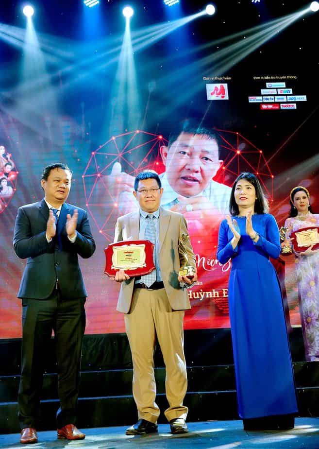 TS Nguyễn Hồng Tây – Phó Trưởng Văn phòng Đại diện của Bộ LĐ-TB&XH tại TP. HCM và bà Nguyễn Thị Minh Phương – Phó Cục trưởng Cục Hành chính Quản trị 2, Văn phòng Chính phủ trao cup và kỷ niệm chương vinh danh các doanh nhân được vinh danh.