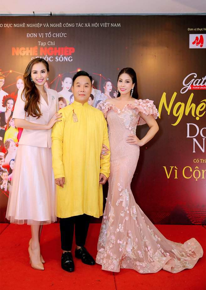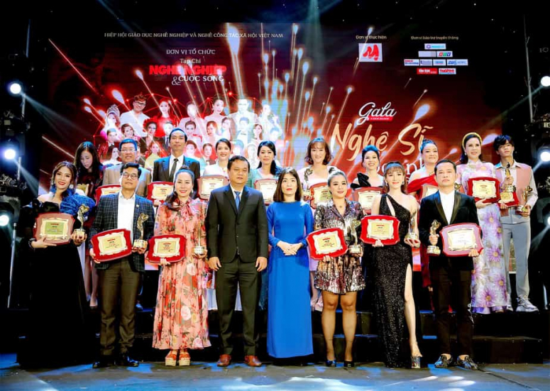 Bà Chử Hà – Tổng biên tập Tạp chí Nghề nghiệp & Cuộc sống và ông Lâm Văn Quản, Chủ tịch Hội Giáo dục nghề nghiệp TP.HCM trao cup, kỷ niệm chương và chụp ảnh lưu niệm cùng các nghệ sĩ được vinh danh