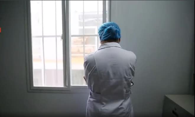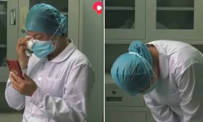 Hôm 13/2, Đài CGTN của Trung Quốc chia sẻ video quay cảnh một nữ y tá đeo khẩu trang, mặc quần áo bảo hộ, cầm điện thoại khóc nức nở ở một góc trong khu vực cách ly.