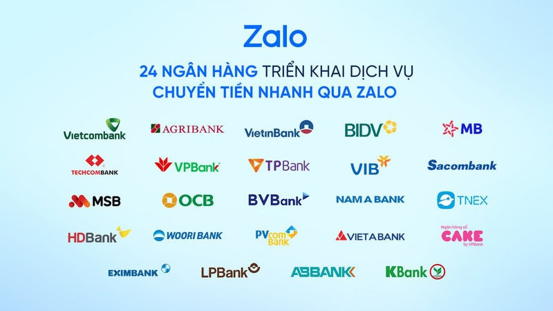 Zalo vừa hoàn tất tích hợp tính năng chuyển khoản nhanh với Agribank và Vietcombank, nâng tổng số ngân hàng triển khai dịch vụ này lên 24 đơn vị. Trước đó, BIDV và VietinBank cùng với nhiều ngân hàng khác đã được tích hợp tính năng chuyển khoàn nhanh trên Zalo.