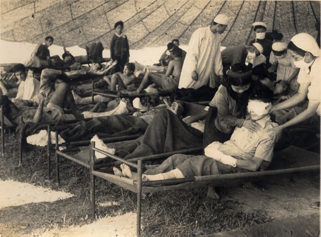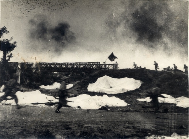 Ngược dòng sông Mã (Thanh Hóa), từng đoàn thuyển vượt qua những ghềnh thác nguy hiểm chuyển gạo lên phục vụ chiến dịch Điện Biên Phủ năm 1954. Ảnh: Trung tâm Lưu trữ quốc gia III thuộc Cục Văn thư Lưu trữ nhà nước.Đoàn dân công đẩy xe đạp thồ chở vũ khí, lương thực, thuốc men… lên trận tuyến. Trong chiến dịch Điện Biên Phủ, bộ đội và dân công của ta đã sử dụng hơn 20.000 xe đạp thồ, vận chuyển hàng trăm kmMột đơn vị phất cờ “Quyết chiến, quyết thắng” đánh chiếm cầu Mường Thanh, năm 1954. Ảnh: Trung tâm Lưu trữ quốc gia III thuộc Cục Văn thư Lưu trữ nhà nước.Khu chứa bom napan của địch bị trọng pháo của ta phá hủy năm 1954. Ảnh: Trung tâm Lưu trữ quốc gia III thuộc Cục Văn thư Lưu trữ nhà nước.Ngay tại mặt trận Điện Biên Phủ, thương binh địch được săn sóc, cứu chữa rất chu đáo năm 1954. Ảnh: Trung tâm Lưu trữ quốc gia III thuộc Cục Văn thư Lưu trữ nhà nước.Bộ đội Việt Nam bắt tay một lính Pháp bị thương.Quân ta xung phong lên chiếm cột cờ một lô cốt của địch ở Đồi C1 năm 1954. Ảnh: Trung tâm Lưu trữ quốc gia III thuộc Cục Văn thư Lưu trữ nhà nước.Bộ đội ta đang theo giao thông hào tiến sát vào vị trí Him Lam năm 1954. Ảnh: Trung tâm Lưu trữ quốc gia III thuộc Cục Văn thư Lưu trữ nhà nước.Chiếc xe tăng 18 tấn của địch bị quân ta chiếm ngay từ đầu, tất cả địch ở trên xe đều xin hàng năm 1954. Ảnh: Trung tâm Lưu trữ quốc gia III thuộc Cục Văn thư Lưu trữ nhà nước.Xác máy bay của quân đội Pháp bị hạ nằm ngổn ngang khắp mặt trận Điện Biên Phủ năm 1954. Ảnh: Trung tâm Lưu trữ quốc gia III thuộc Cục Văn thư Lưu trữ nhà nước.Khu trung tâm Mường Thanh của địch rung lên và bốc cháy vì đạn đại bác của ta năm 1954. Ảnh: Trung tâm Lưu trữ quốc gia III thuộc Cục Văn thư Lưu trữ nhà nước.Lính địch ở sây bay ra hàng năm 1954. Ảnh: Trung tâm Lưu trữ quốc gia III thuộc Cục Văn thư Lưu trữ nhà nước.Đại tướng Tổng Tư lệnh Võ Nguyên Giáp đọc Nhật lệnh trong buổi lễ chiến thắng năm 1954. Ảnh: Trung tâm Lưu trữ quốc gia III thuộc Cục Văn thư Lưu trữ nhà nước.Binh lính Pháp giơ tay đầu hàng sau thất bại trước quân đội Việt Nam. Trải qua 3 đợt chiến đấu gay go và gian khổ liên tục trong 56 ngày đêm, chiến dịch Điện Biên Phủ kết thúc thắng lợi vào ngày 7/5/1954.