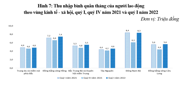 Quý I năm 2022, thu nhập bình quân tháng của người lao động có sự gia tăng mạnh trong hầu hết các ngành kinh tế chủ yếu so với quý trước (bình quân 6,4 triệu/ tháng). Lao động làm việc trong khu vực công nghiệp và xây dựng là 7,3 triệu đồng, đây là khu vực có tốc độ tăng thu nhập bình quân tăng cao nhất trong ba khu vực kinh tế, tăng 22,6% so với quý trước, tăng tương ứng hơn 1,3 triệu đồng; lao động làm việc trong ngành dịch vụ có thu nhập bình quân là 7,5 triệu đồng, tăng 20,5% so với quý trước, tăng tương ứng gần 1,3 triệu đồng.