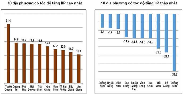 Chiều ngược lại, một số địa phương có chỉ số IIP tăng thấp hoặc giảm do ngành công nghiệp chế biến, chế tạo; ngành khai khoáng và ngành sản xuất, phân phối điện tăng thấp hoặc giảm. Điển hình như Quảng Nam giảm 38,9%; Bà Rịa – Vũng Tàu giảm 18,2%; Vĩnh Long giảm 15,7%; Sóc Trăng giảm 15,5%; Lai Châu giảm 15,3%; Đà Nẵng giảm 10,4%; Bắc Ninh giảm 9,1%; Quãng Ngãi giảm 8,5%; Hà Giang giảm 6%