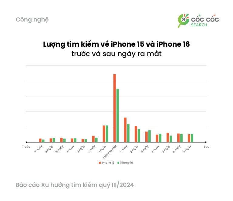 Trong lĩnh vực công nghệ, iPhone 16 ra mắt cuối tháng 9/2024 thu hút sự quan tâm lớn từ cộng đồng. Dù được đánh giá là không có nhiều đột phá, lượng tìm kiếm về sản phẩm này vẫn tăng gấp 3,22 lần so với quý trước.