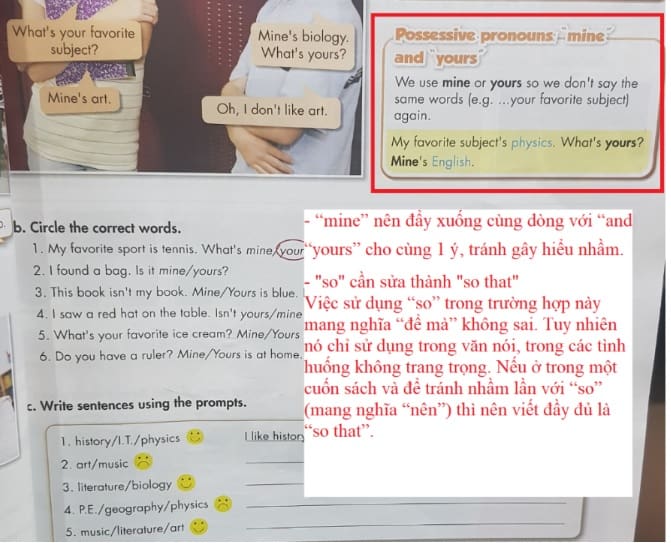Tiếp đến, tại trang 15, phần Possessive pronouns: “mine” and “yours”. “Mine” nên đẩy xuống cùng dòng với “and your” cho cùng một ý, tránh hiểu nhầm. “So” cần sửa thành “so that”. Việc sử dụng “so” trong trường hợp này mang nghĩa “để mà” không sai. Tuy nhiên, nó chỉ sử dụng trong văn nói, trong các tình huống không trang trọng. Nếu ở trong một cuốn sách và để tránh nhầm lẫn với “so” (mang nghĩa “nên”) thì nên viết đầy đủ là “so that”.