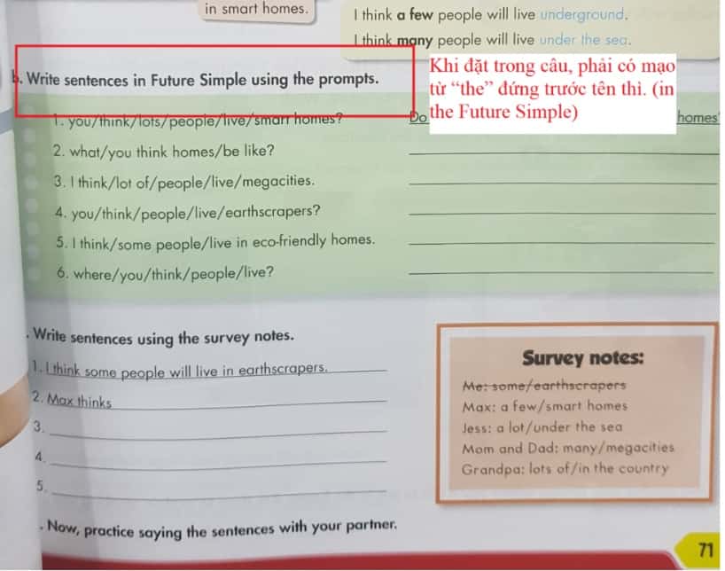 Tại trang 71, mục b, khi đặt trong câu, cần phải có mạo từ “the” đứng trước tên thì (in the Future Simple).