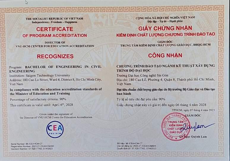 Chương trình đào tạo ngành Kỹ thuật xây dựng trình độ đại học của STU được đánh giá theo tiêu chuẩn chất lượng giáo dục do Bộ trưởng Bộ GD&ĐT ban hành gồm 11 tiêu chuẩn, 50 tiêu chí, với kết quả đánh giá chất lượng giáo dục như sau: Số tiêu chí đạt yêu cầu là 45 trên tổng số 50 tiêu chí (đạt 90%). Trên cơ sở đó, ngày 07/4/2023, CEA VNU-HCM đã ký Quyết định công nhận chương trình đào tạo ngành Kỹ thuật xây dựng trình độ đại học Trường Đại học Công nghệ Sài Gòn đạt tiêu chuẩn chất lượng giáo dục do Bộ trưởng Bộ GD&ĐT ban hành.