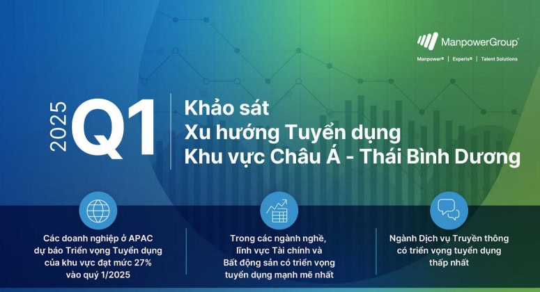 ManpowerGroup – Một tập đoàn cung cấp giải pháp nhân sự toàn cầu vừa công bố Báo cáo Khảo sát Xu hướng Tuyển dụng Khu vực Châu Á – Thái Bình Dương Quý I/2025 với dữ liệu được thu thập từ hơn 10.000 nhà tuyển dụng trên bảy quốc gia và vùng lãnh thổ thuộc khu vực APAC.