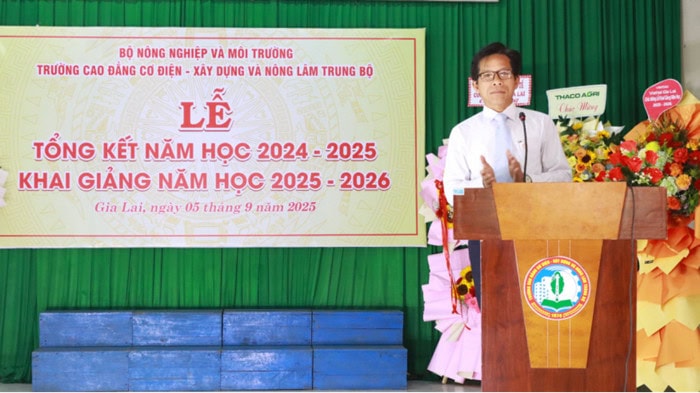 Ông Phạm Ngọc Minh – Phó hiệu trưởng Trường Cao đẳng Cơ điện Xây dựng và Nông lâm Trung bộ trang trọng đọc Thư chúc mừng của Chủ tịch nước Lương Cường gửi ngành Giáo dục nhân dịp khai giảng năm học 2025-2026
